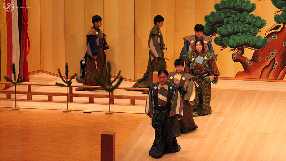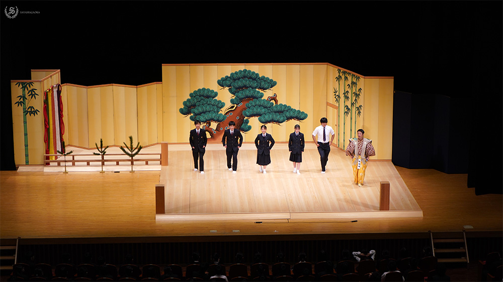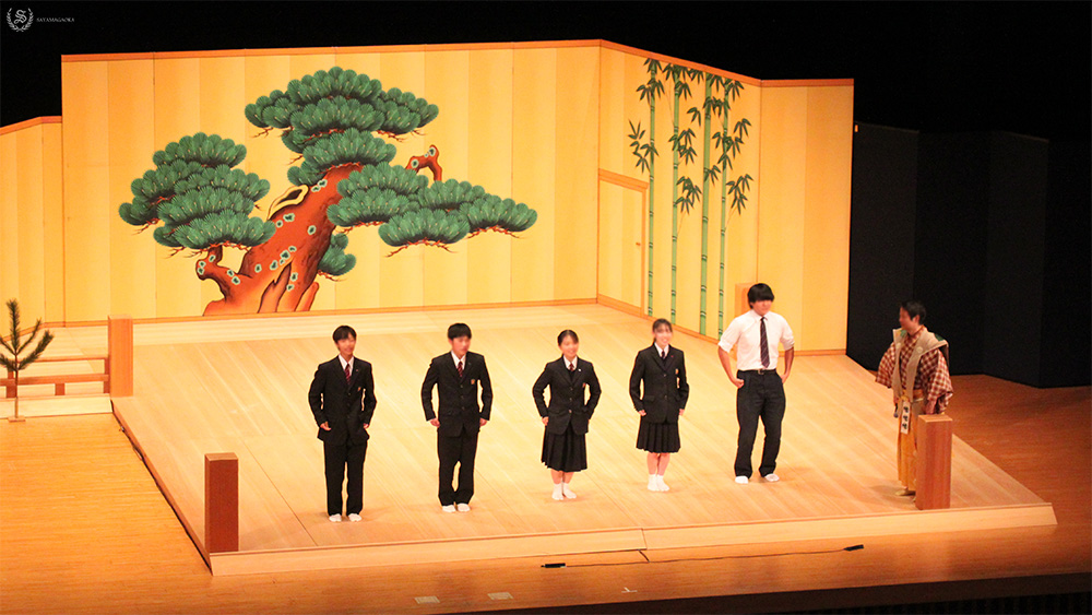 生徒たちは本番の約2週間前から、校内で狂言師の方と稽古を重ね、当日は実際に装束を身につけて舞台に立ちました。練習の成果を発揮し、堂々とした姿で迫真の演技を披露し、会場からは大きな拍手が送られました。