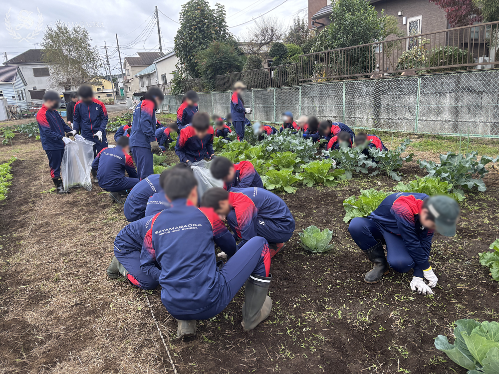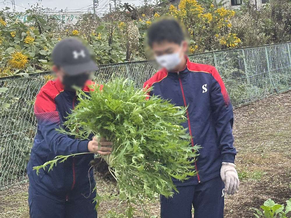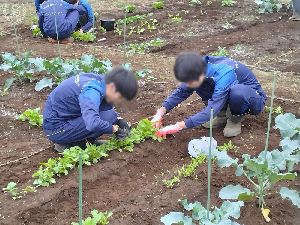 2学期のはじめに植えた冬野菜は多くのものが順調に生育し、収穫が目前に控えています。中には思うように生育が進まないものもあり、作物を育てることの奥深さや難しさを実感しながらも、生徒たちは、野菜の豊かな成長を促すため、追肥や除草、間引きなどの手入れに汗を流しています。