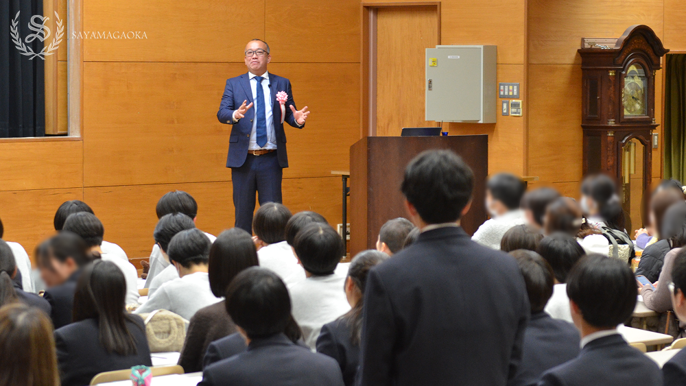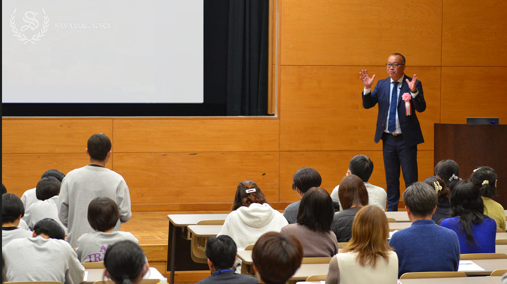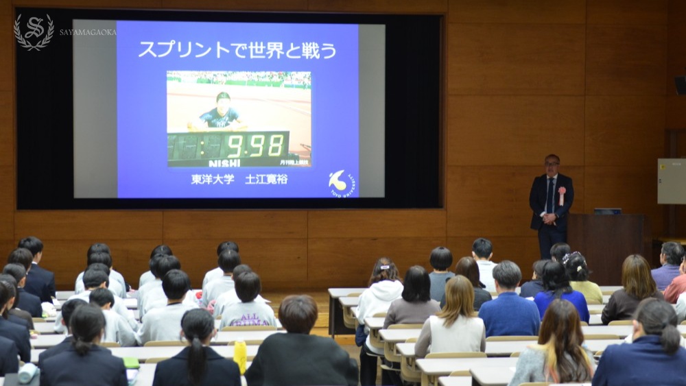 令和8(2026)年2月14日(土)、本校の講堂にてPTA父母教室が開催されました。講師として東洋大学陸上競技部コーチの土江寛裕さんをお招きし、「スプリントで世界と戦う」というテーマでご講演をいただきました。日本を代表する指導者の熱いメッセージに、会場に集まった生徒や保護者、教職員一同が真剣に耳を傾けました。
