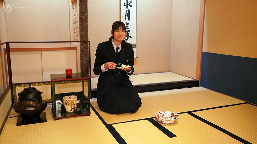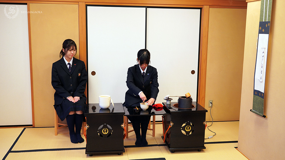 本校茶道部(裏千家)は、地域行事として恒例となっている「第36回さやま大茶会」で野点の茶会を行います。部員たちは事前に所作の確認や接待の練習を重ね、心を込めて来場者をお迎えする準備を進めています。
