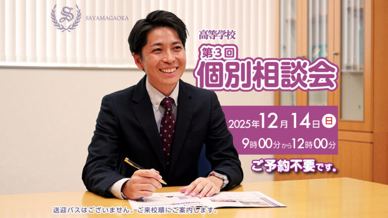【ご予約不要】第3回狭山ヶ丘高等学校の個別相談会のご案内です。12月14日(日)9時~12時で行います。ご予約不要(ご来校いただいた順にご案内します)です。 -