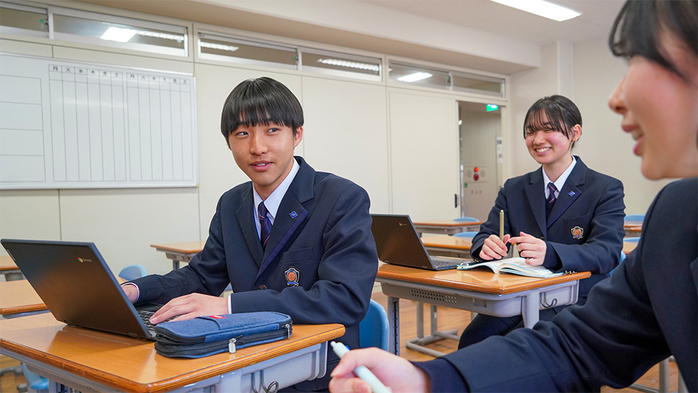 本校ではGoogle社が運営する教育支援コンテンツ「Google Workspace for Education」を活用し、生徒一人一人に学校用アカウントを発行し、様々なアプリケーションが活用しながら学習支援を行っています。2023年度からは生徒一人一人がChromebook(タブレット型PC)を持つ体制を確立し、校内LAN環境も拡充しました。