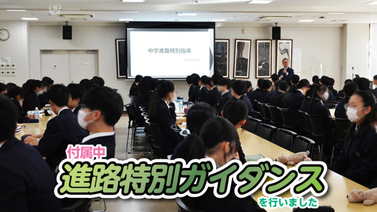 2025年12月10日(水)、付属中学校の全校生徒を対象に「進路特別指導」を実施しました。 本校教頭より、本校が定期的に受験している学外模試の結果を踏まえながら、数年後に控える大学受験を見据えた学習への取り組み方について講話がありました。 生徒たちは、日頃の学習習慣を振り返り、これからの目標に向けて意識を新たにする機会となりました。 -